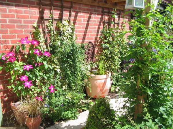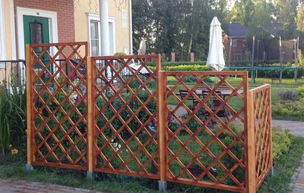 Клумбу с высокорослыми растениями можно оградить легким забором, изготовленным из реек. Решеткой больших размеров можно отделить зону отдыха.