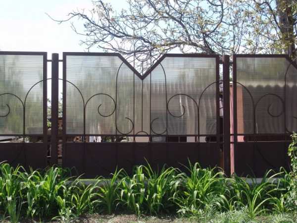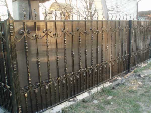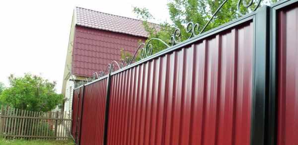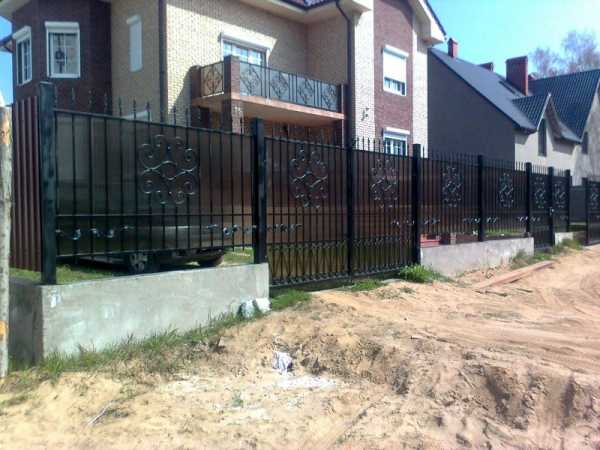 Металлические листы фиксируют при помощи саморезов на заранее приготовленный каркас из профильной трубы. В качестве декоративных элементов, используют кованные детали. Такой забор способен прослужить достаточно долгий промежуток времени.