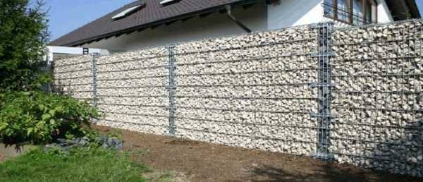Сначала делают декоративные столбы для забора, лучше из бетона. Металлическую сетку натягивают между столбов, внутрь укладывают булыжники. Камни удобнее плоской формы, чтобы удобнее было конструировать другие ряды. Для прочности камни нужно соединять цементом.