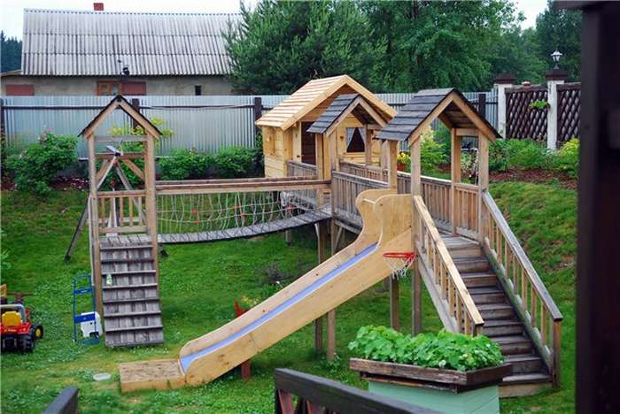 Сделать полноценную детскую площадку с горкой, лестницей, балконом, канатом, лазом и качелями можно своими руками. В этом вам поможет следующее руководство. В нем множество подробных фотографий, поэтому никаких проблем с изготовлением элементов конструкции и их установкой не возникнет.