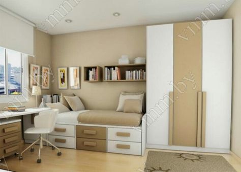Вариант для подростка 16 лет. Здесь уже другая форма помещения — вытянутый прямоугольник, а значит зоны лучше выделять последовательно. Так, сразу при входе идет хранение вещей, затем место для отдыха с кроватью и открытыми полками, а у окна — уголок для учебы. От спального места его отделяет компактный стеллаж, который играет роль перегородки.