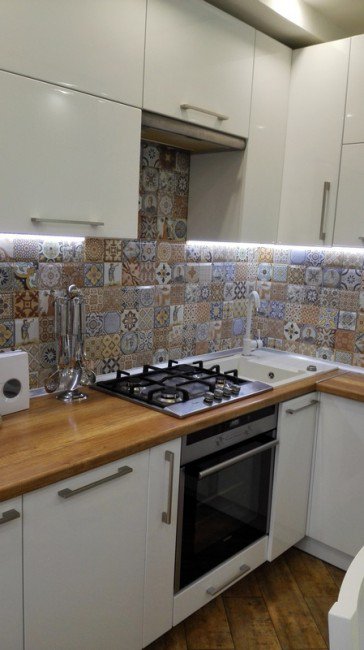 На фото маленькая кухня с фартуком, отделанным фигурной плиткой.