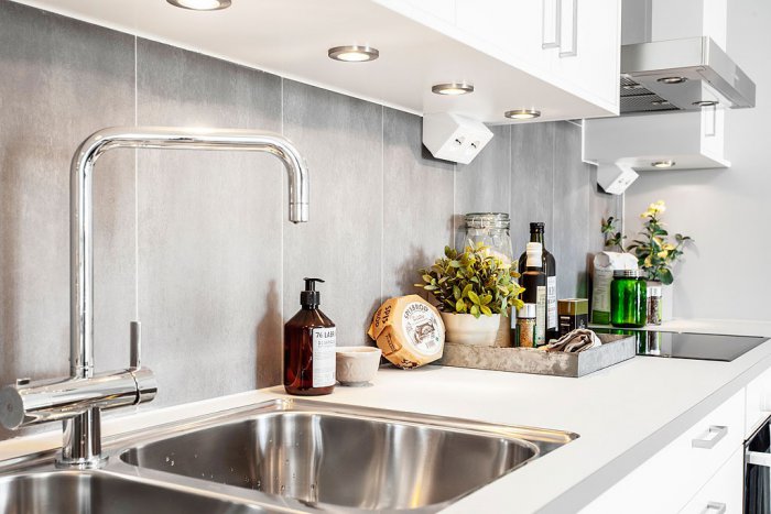Минус в том, что на полированном покрытии легко остаются царапины, брызги, разводы, капли воды и отпечатки пальцев. Частично эту проблему решает матовое покрытие, но оно вписывается не в каждую отделку. Учитывай и то, что металлический фартук не подойдет для классических интерьеров, прованса и декоративных стилей.
