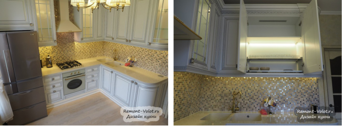 Для создания оригинального дизайна фартука можно использовать встроенную подсветку. Такое решение не только привлекает внимание и придает оформлению выразительности, но и за счет дополнительного освещения визуально увеличивает площадь кухни.