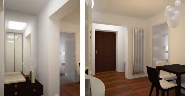 Это фото ремонта малогабаритной 2 комнатной квартиры. В ней проживает один человек, потому было принято решение снести большую часть стен. Прихожая в квартире очень маленькая: буквально шкаф с одной стороны и небольшая тумба с зеркалом с другой. Стены почти белые, яркое освещение.