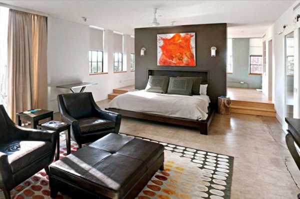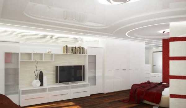 Подобный вариант приемлем для семьи из двух человек, например, молодой семейной пары, которая любит устраивать вечеринки и приглашать гостей. Чтобы хоть как-то увеличить площадь гостиной (зала) идут на объединение ее со спальней. Но при этом нужно четко осознавать, что для спальной зоны должно применяться четкое зонирование, так как место для отдыха лучше спрятать от посторонних глаз.