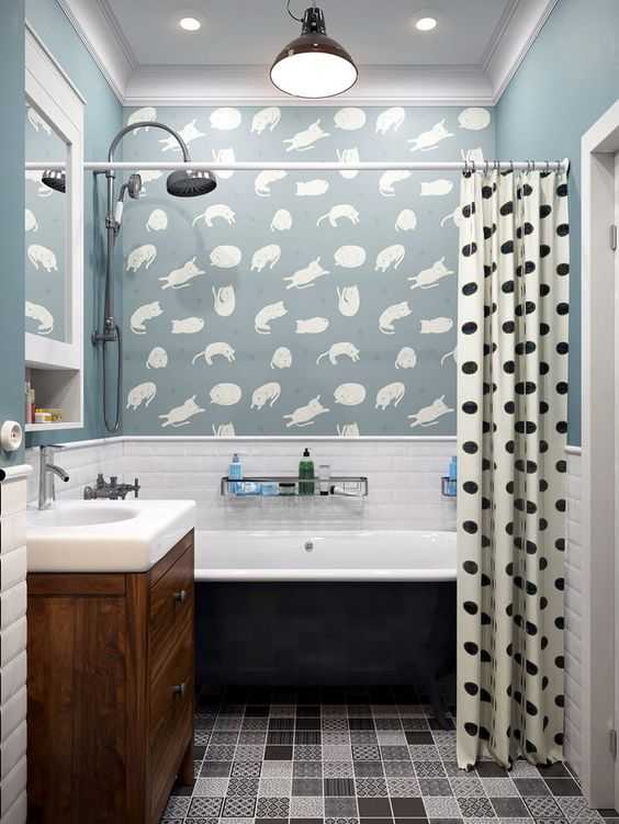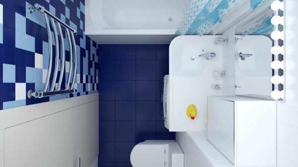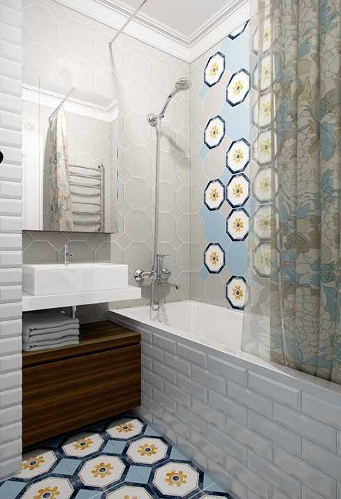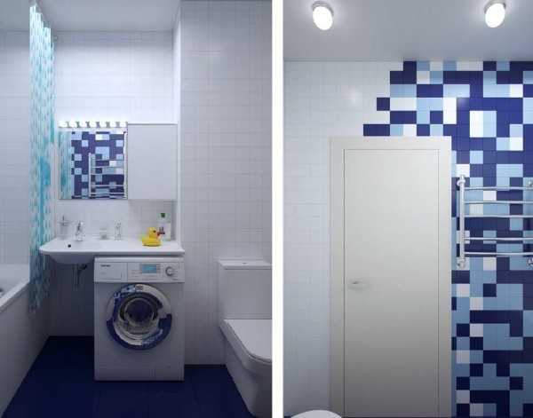 Для того чтобы помещение не казалось таким уж маленьким, плитка на стены уложена белая глянцевая. Изюминкой этого интерьера являются панно из плитки в синей гамме — одном из цветов, который присутствует в оформлении других помещений.