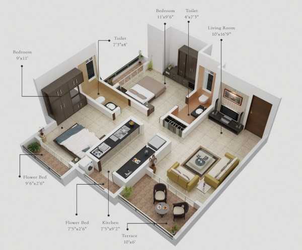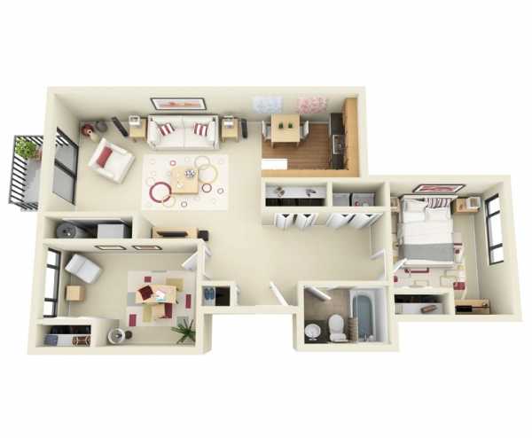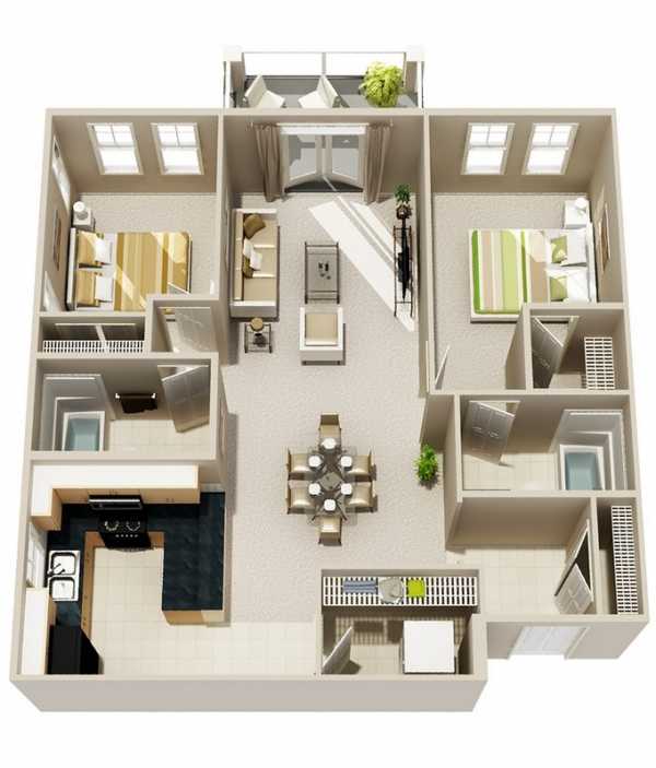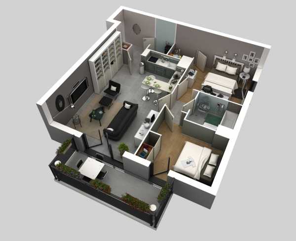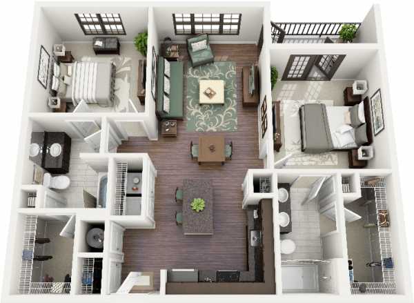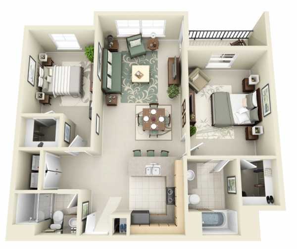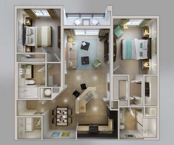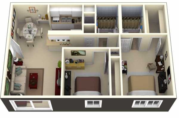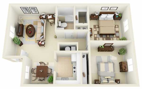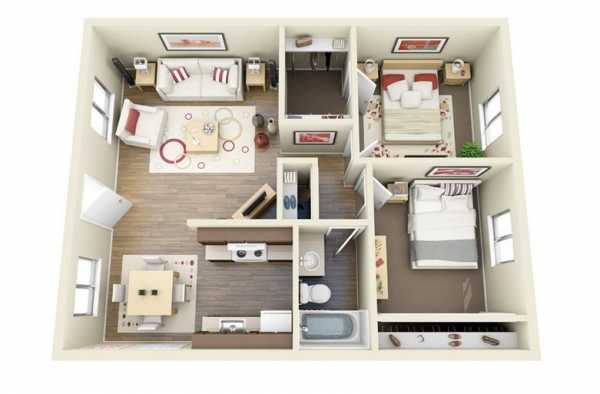 Квартиры с двумя спальнями отлично подходят для пар и небольших семей. Они являются одной из самых распространенных планировок. Это связано с тем, что такая недвижимость идеально сочетает доступную цену и комфорт проживания. Она гораздо удобнее, чем дома с одной спальней или студии. В этой статье рассматриваются наиболее интересные планировки в виде 3D проектов.