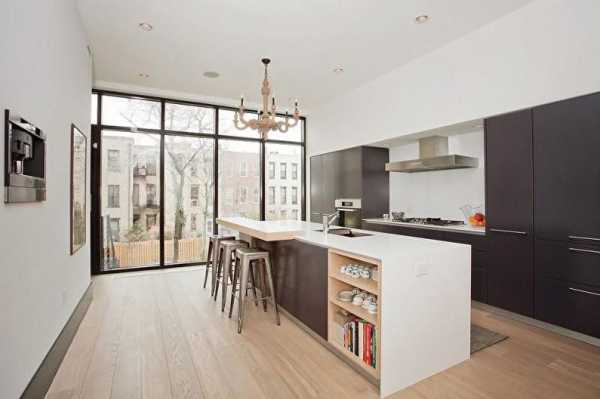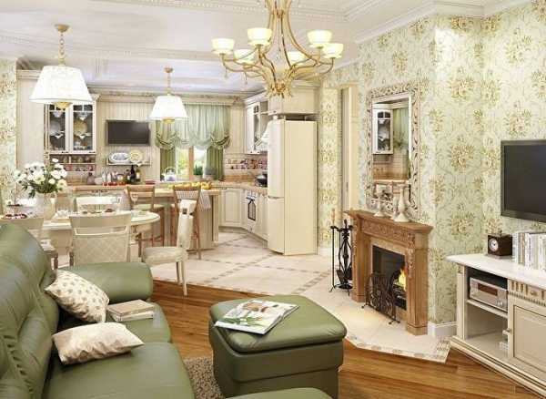 Довольно распространенное решение, так как кухни в старых домах довольно тесные. Разделение одной комнаты на кухонную и гостиную зоны позволяет расширить рабочее пространство для приготовления пищи и при этом не мешать друг другу. Один готовит, второй принимает пищу, третий — отдыхает на диване. Вполне пригодное пространство для семьи из трех человек, которые смогут проводить больше времени вместе.