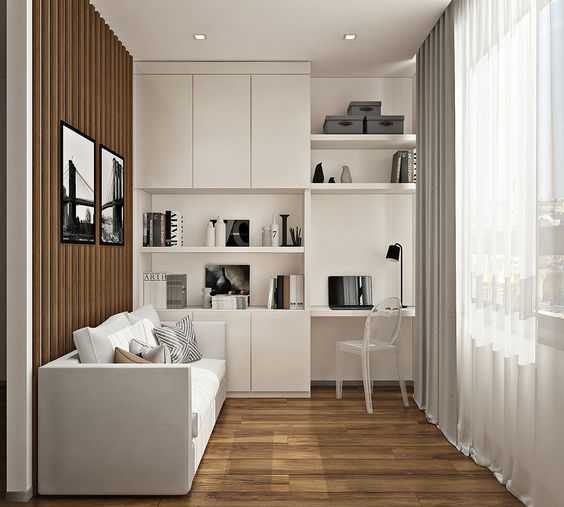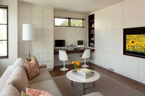 Гостиная-кабинет. Если гостиная не объединена с кухней, выделить в ней место для рабочего кабинета не составит труда. Для этого можно использовать перегородку в виде двухстороннего стеллажа, который еще и станет полноценным дополнением интерьера.
