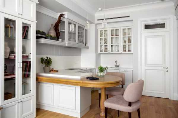 Вход в кухню сразу из прихожей. Чтобы техника не слишком выделялась на фоне светлых стен, она тоже вся сделана белой, как и столешница и стулья. Темные дверки шкафов повторяются в темной столешнице обеденного стола.