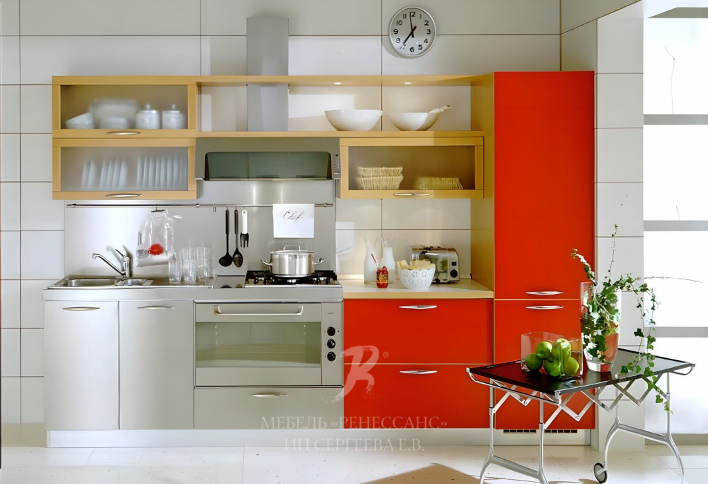 Кухонный гарнитур с фасадами в стиле ретро. Мебель напоминает те знаменитые советские стенки, которые стояли в каждой гостиной.