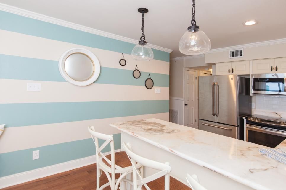 Read McKendreeМаленькая морская картина в рамке над шкафами — приятный сюрприз. Поскольку верхняя часть покрывает почти всю стену в этой прибрежной кухне, спроектированной Кевином Исбеллом, стеклянные корпуса получают немного забавы с узорчатой тканевой подкладкой.