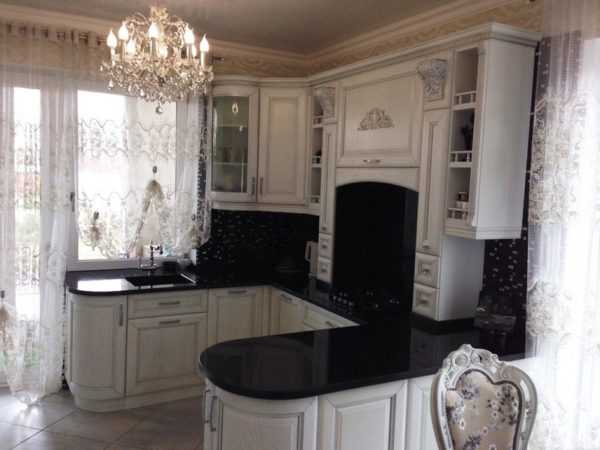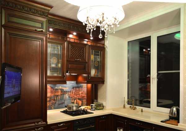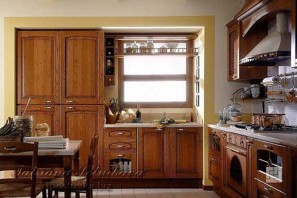 Хотя классический дизайн не приветствует нестандартность решений, в этом случае это необходимо. Вполне приемлемо расположить гарнитур в классическом стиле вдоль стены или П-образно, задействуя пространство под окном. Для классического исполнения под окном уместно будет расположить стол или тумбы с полками. Нежелательно размещать здесь мойку и рабочий стол – хотя это решение выглядит оригинально, но стиль при этом сильно пострадает.
