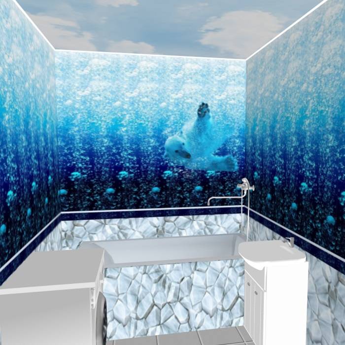 Они будут смотреться дорого и стильно. Их особенность в трехмерном изображении, которое делает рисунок на панели реальным. При отделке ванной пластиковыми 3D панелями можно зонировать комнату и визуально её расширить. Изображения бывают разные: геометрия, орнаменты, абстракция, растения, животные и так далее.
