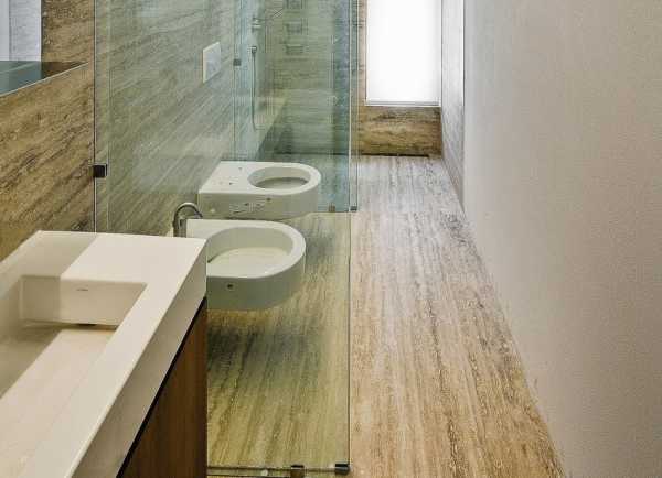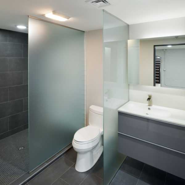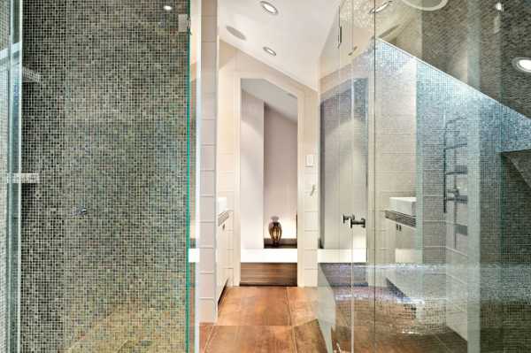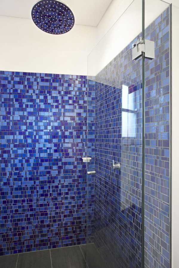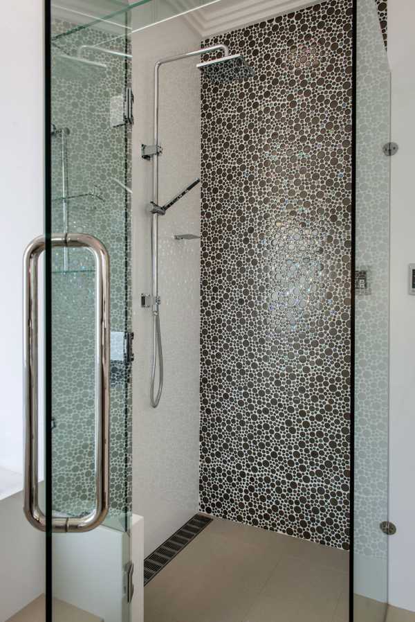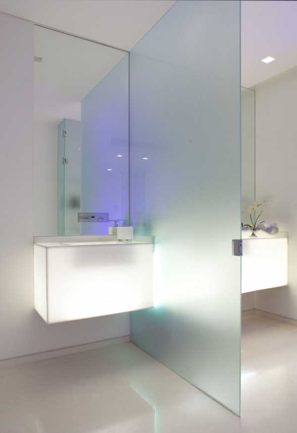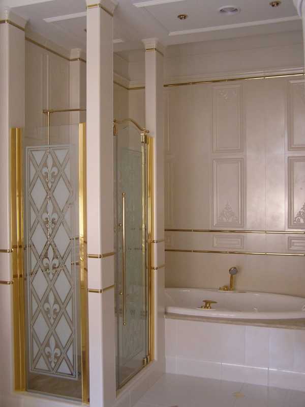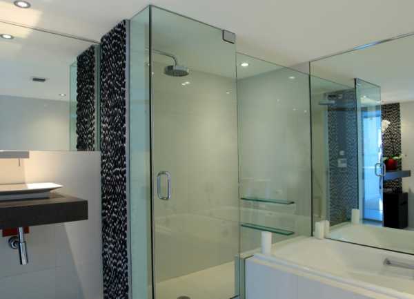 Сложнее работать с закаленным, листовым стеклом, которое гармонично и отлично сочетается с блестящими поверхностями сантехники и душевых поддонов, кафельной плиткой и глянцевыми подвесными потолками.