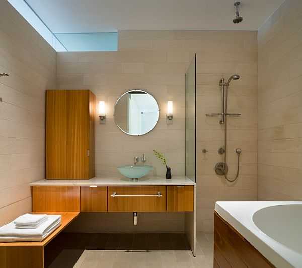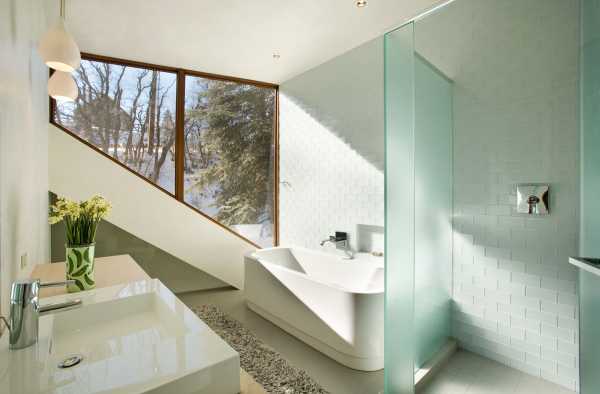 Экспериментируйте с цветовым оформлением, материалами, освещением. Добавляйте живые комнатные растения в интерьер в качестве сочных элементов. А если планировка позволяет, то максимально расширьте оконные проёмы, добавив дневного света. Удачным будет также совмещение в интерьере душевой кабинки и автономной ванны – прекрасного актуального дизайнерского решения.