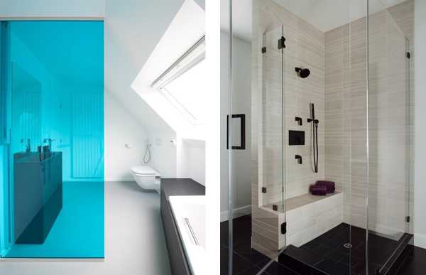 Перегородки из цветного и простого стекла в интерьере ванной комнататы