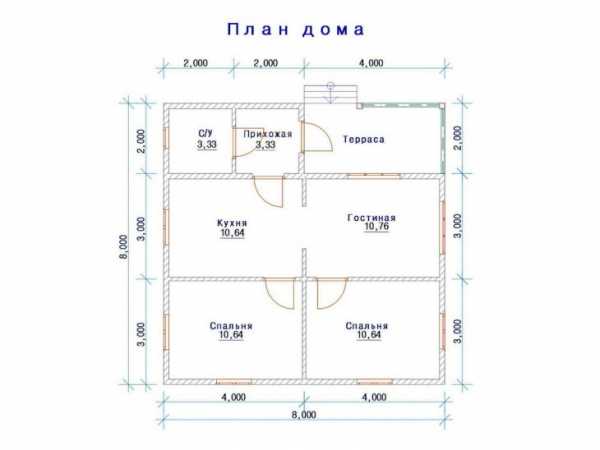 Что касается планировки дома 8 на 8 м, ее можно поменять в процессе строительства, добавив дополнительные стены, или убрав неответственные конструкции.
