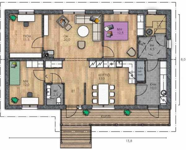Аналогичным образом можно разместить гостиную. Одноэтажный дом 8 на 8 вполне позволяет обустроить 2 спальни, гостиную, кухню и санузел. Причем площадь каждого помещения будет довольно комфортной.