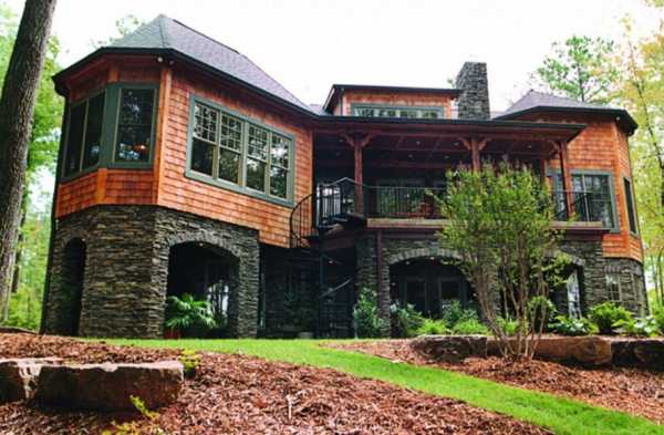 35. Неброский дизайн загородного дома на фото в стиле кантри напоминает сельские фермерские дома викторианской эпохи Англии. Высокий, отделанный камнем, цокольный этаж использован для обустройства кухни и подсобных помещений.