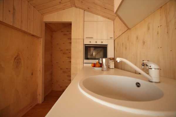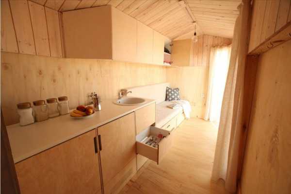 В деревянном автодоме площадью 9 кв. м и высотой 240 см есть все необходимое: спальня, кухня, санузел. Домик сделан из облегченных натуральных материалов — фасад и интерьер из промасленного соснового массива, а пол — из легкой березовой фанеры. Один из фасадов полностью стеклянный, поэтому в фургоне всегда светло.