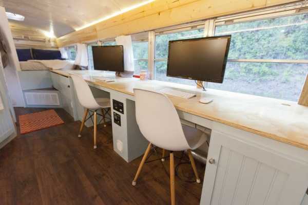 Предусмотрены даже два рабочих места с компьютерами, ящиками, розетками и системным блоком. Все максимально продумано и удобно.