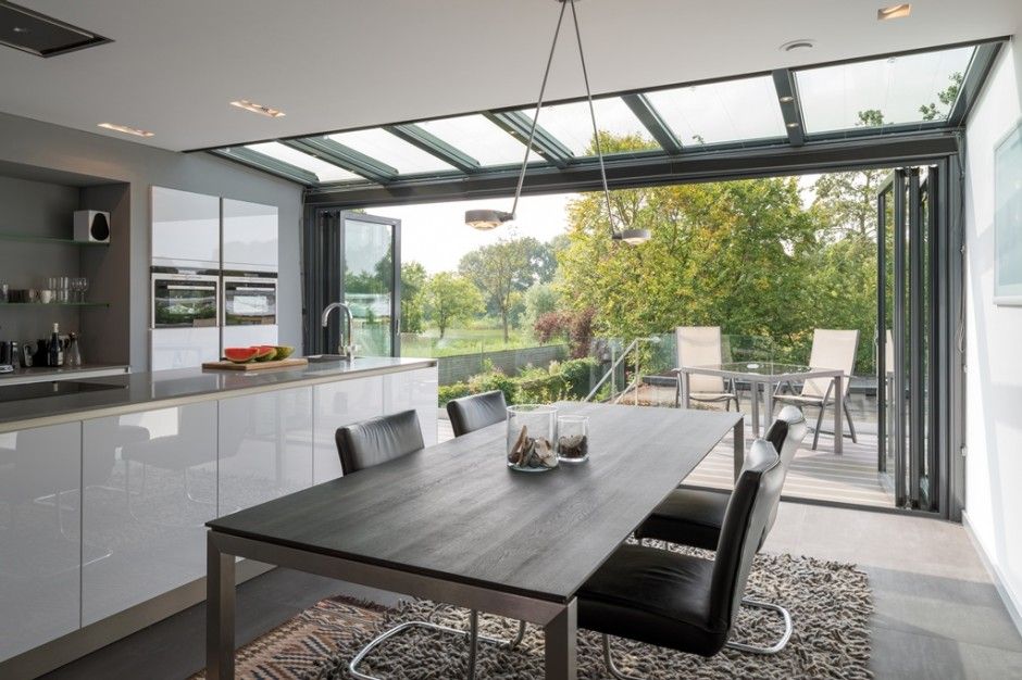 Современная идея: Если конфигурация дома позволяет, сделайте большие окна и стеклянные двери на всю высоту стены. Это смотрится очень эффектно и необычно. Но выполненная в таком современном стиле кухня имеет свои ограничения.