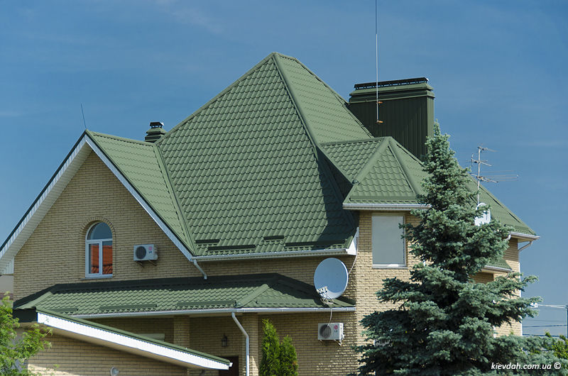 Выбрав зеленый цвет металлочерепицы можно создать привлекательный частный дом. Достоинство зеленого цвета – универсальность, ведь выбрав зеленую крышу нет ограничений по отделке фасада ни в цветовой гамме, ни в материале облицовки дома. Единственное, что при этом важно учесть, многие производители не соблюдают цветовых стандартов, поэтому весь материал нужно закупать только у одного конкретного производителя.