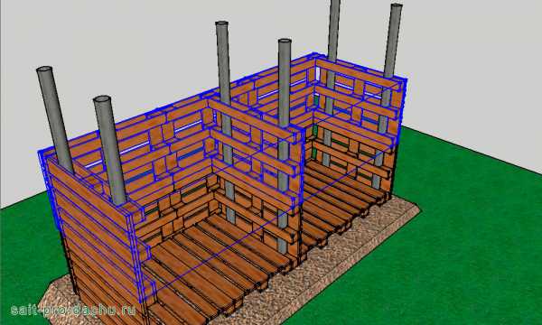 Начинаем строительство с пола. Как всем известно – доски подвержены гниению и не любят контактировать с землей. Для того чтобы наше сооружение простояло долгое время – нам необходимо сделать примитивный фундамент. Рассмотрим же все действия пошагово.