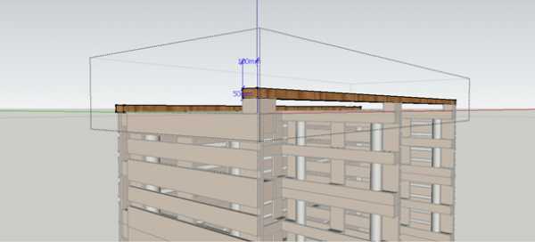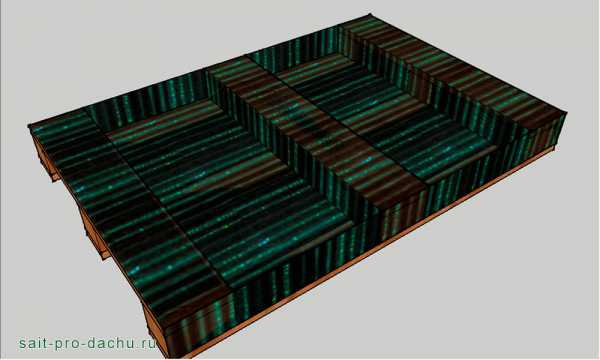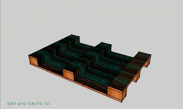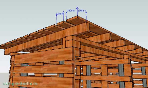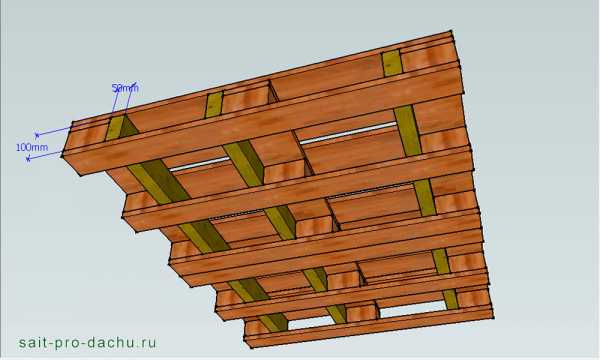 Теперь настала очередь кровли. Для ее изготовления запаситесь, помимо пятидесятых досок, еще и полудюжиной поломанных поддонов. Например, для организации кровельного уклона вам понадобятся из них три «шашки». У европаллет они, кстати, имеют размер 144×100×78 мм.