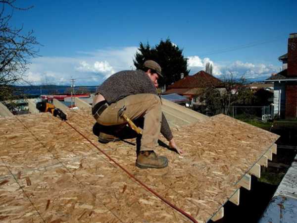 - Установка кровельных листов. Возьмите фанеру и закрепите на стропилах 2-дюймовыми стальными проволочными гвоздями через каждые 35 см. Листы должны покрывать планки.