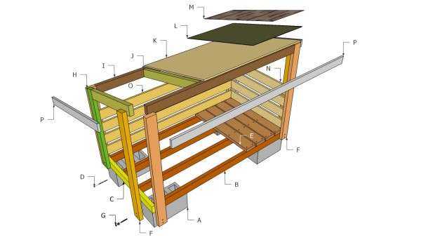 Не буду приводить здесь список материалов и порядок строительства, процесс по сути такой же, как в предыдущих примерах, а количество материалов будет зависеть от размеров конструкции, то есть от ваших потребностей. Единственное отличие от предыдущих вариантов, в данном случае добавлена передняя панель и изменена конструкция крыши. Строительство небольшого переднего свеса не только добавит стиль сарайчику, но и защитит дрова от сильного дождя или снега. Порядок изготовления передней стены такой же, как и остальных, просто убедитесь, что вы оставили большое отверстие, чтобы иметь доступ к дровам. Этапы сборки показаны на чертежах и думаю там все понятно, если нужна подробная инструкция, ссылку найдете под галереей.