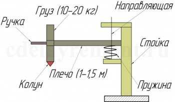 Самый простой механический дровокол напоминает колодезный журавль. Конструкция один к одному, только вместо ведра закреплен резак и ручки. Соединение стойки (стоек) и перекладины можно сделать самым простым — шарнирным. Потребуется только хорошая смазка.