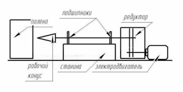 - Конусный тип. Распилка дров производится конусом с резьбой, который в процессе вращения врезается в бревно, разделяя его на части. Так же как и реечный дровокол, его достаточно просто сделать самостоятельно. Единственным нюансом является необходимость в более мощном двигателе.