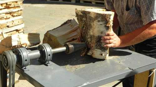 Чурбаки раскалываются за счет того, что вращаемый мотором конус врезается в древесины, постепенно разрывая на части. У больших чурбаков откалывают сначала края, затем разрывают середину.