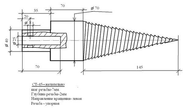 Чертеж с размерами конуса с резьбой для винтового дровокола