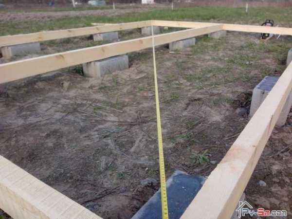 Уложив доски по периметру и скрепив их, сразу же проверил диагонали. Это нужно делать периодически, чтобы не построить кривую постройку.