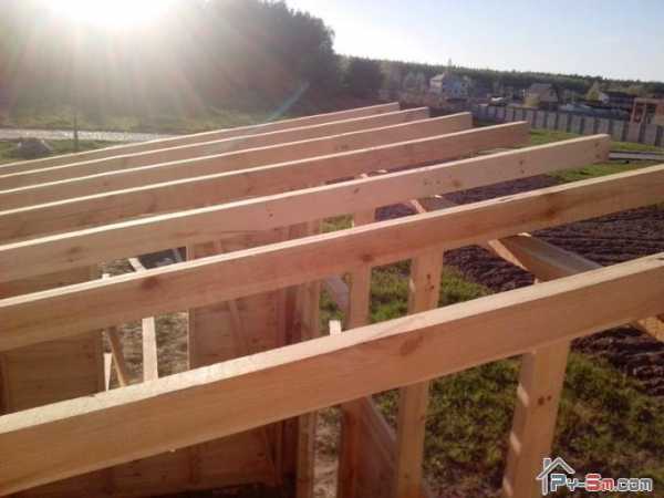 После того, как каркас стен собран, можно устанавливать стропила крыши. Это те ж самые доски 100х50 мм с шагом около 700 мм. Крепил я стропила с помощью металлических уголков с одной стороны и гвоздями с другой. Напомню, что если вы планируете утепляться, то шаг нужно делать в соответствии с шириной утеплителя.