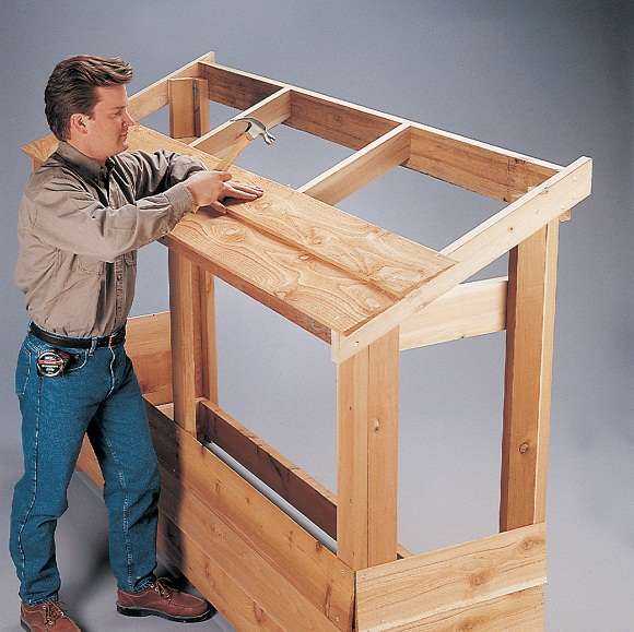 Сбейте каркас и обшейте его досками с промежутками в 5 см. Можно сделать крышу из поликарбоната или другого подручного материала. На время можно вообще закрыть пленкой.