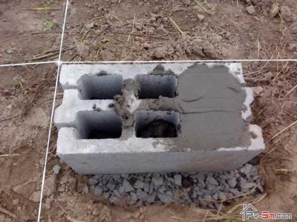Так как сарай планировалось сделать по каркасной технологии, то фундамент можно сделать столбчатый с блоков. Для этих целей я использовал пустотный бетонный блок (просто не нашел цельный), пустоты которого были заделаны раствором.