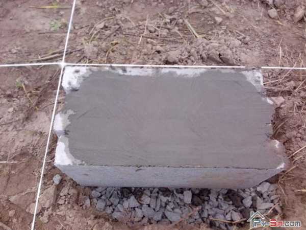 Натянув шпагат, проверил диагонали, они должны быть равными. Разметил места установки блоков и принялся копать ямы глубиной 30 – 50 см. Нужно убрать под блоками растительный слой грунта и засыпать щебнем или песком, что я и сделал. Таким образом, максимально повысил устойчивость фундамента.