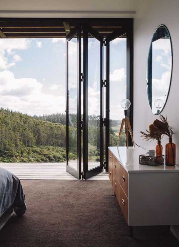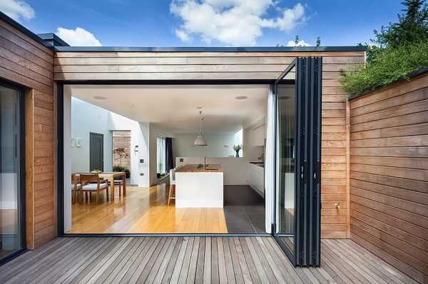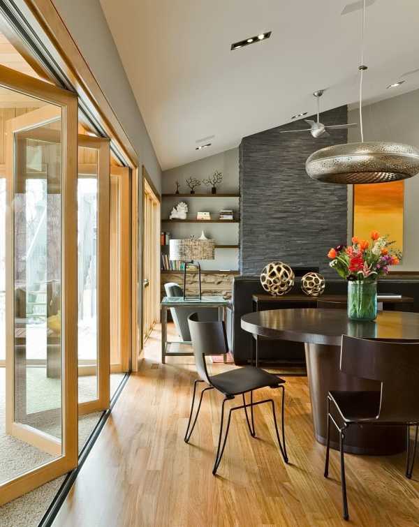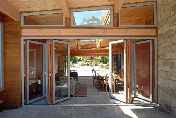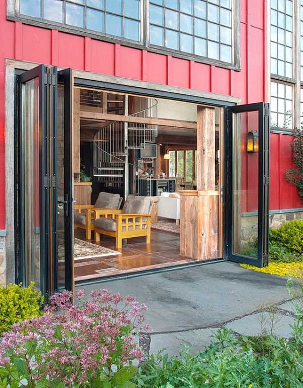 - В загородных строениях такие модели дверей могут быть использованы в виде отделяющей внешней стены. Например, при зонировании гостиной и кухни.