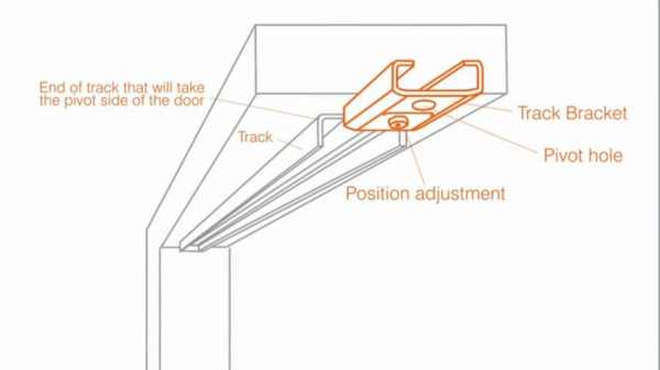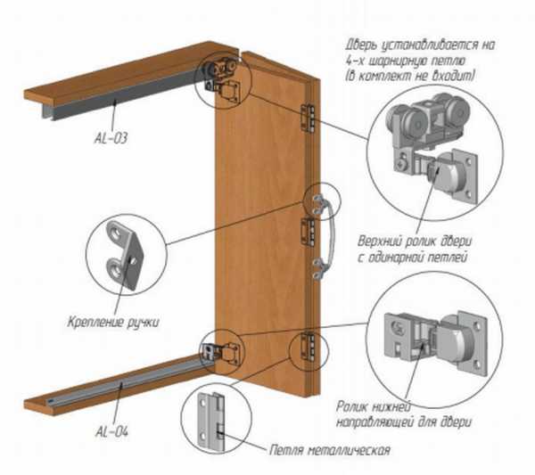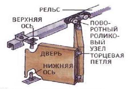 В остальном же, этапы всё те же как и для установки раздвижной двери, то есть, к верхнему торцу дверного полотна устанавливаются на две части его по одному ролику. После того же, как ролики установлены, нужно установить нижнюю ось, на которую будет крепиться одна часть дверного полотна. Теперь можно вставлять ролики в направляющую.