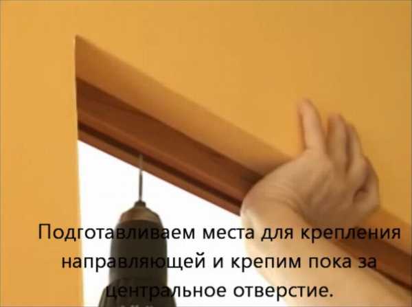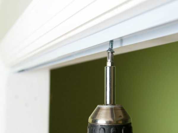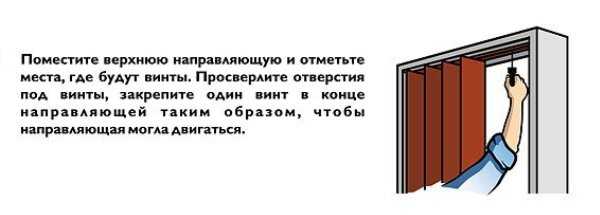Для установки направляющей необходимо сначала измерить ширину дверного проёма. И тут уже появляется первая отличительная черта от установки раздвижной двери-купе. Направляющая для раскладной двери устанавливается не над дверным проёмом, а внутрь его, следовательно, если вы создали декоративный короб, то придётся учитывать его размеры, чтобы не ошибиться. Затем, после того как вы сделали направляющую необходимых размеров, просверлите в ней несколько отверстий и закрепите в проёме на один шуруп, по середине направляющей (это нужно сделать для того, чтобы потом можно было вставить в направляющую дверное полотно) готово, первая часть сделана.