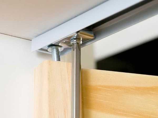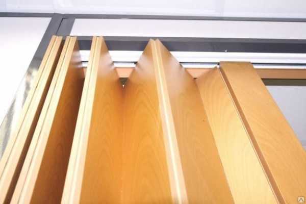 Направляющие есть в верхней части проема. Створки подвешиваются на рельс при помощи крепежных элементов. В качестве материала направляющей для дверей гармошек применяют алюминий или сталь. Для того, чтобы деталь выглядела более эстетично, видимые ее части ламинируются или же отделываются шпоном.