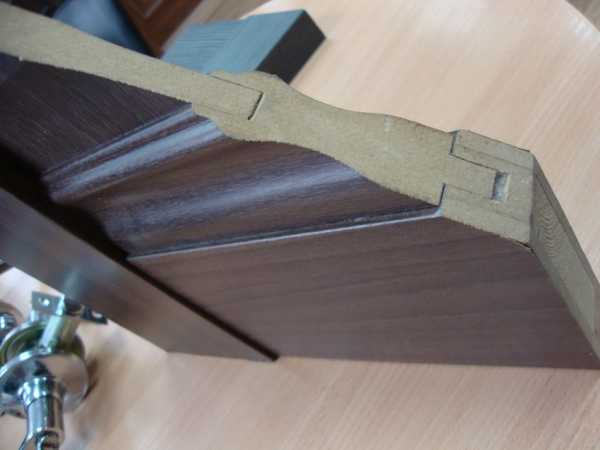 Это самая дешевая конструкция. Внутренность каркаса из дерева заполняется по принципу пчелиных сот картоном. После чего укрепляется подложка и покрывается шпоном.