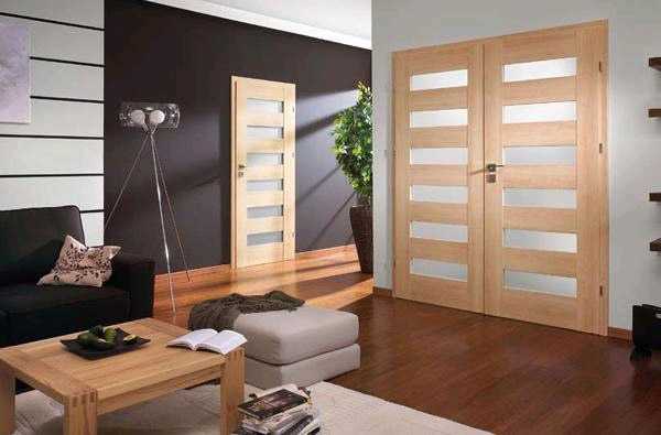 В гостиную люди часто ставят двухстворчатые двери. Часто двери делают стеклянными или украшают различными декоративными элементами. Высота в стандартной квартире составляет 2000 мм, а ширина варьируется от 1280 до 1600 см. Если разделить этот параметр надвое, то получится ширина каждой створки – от 640 до 800 мм.