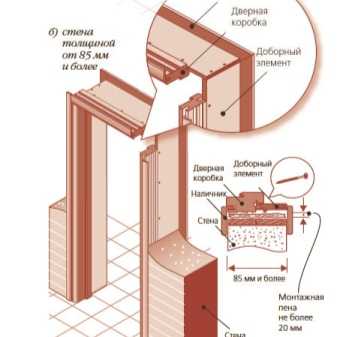 Толщина коробки будет равна толщине стен или перегородок в доме. В кирпичные стены монтируют конструкции, толщиной 75 мм, в деревянные – до 100 мм. Если выбранная дверь и ее коробка узкие, то строители применяют доборные элементы для подгона размера проема под выбранную дверь.
