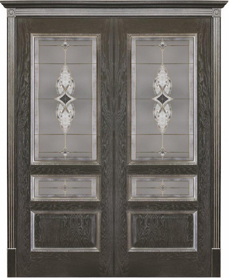 - Английский.Чаще всего в английском стиле применяются натуральные габаритные модели в темных тонах, декорированные капителями или широкими наличниками. С помощью стеклянных вставок можно немного облегчить массивные полотна и придать им грациозности.
